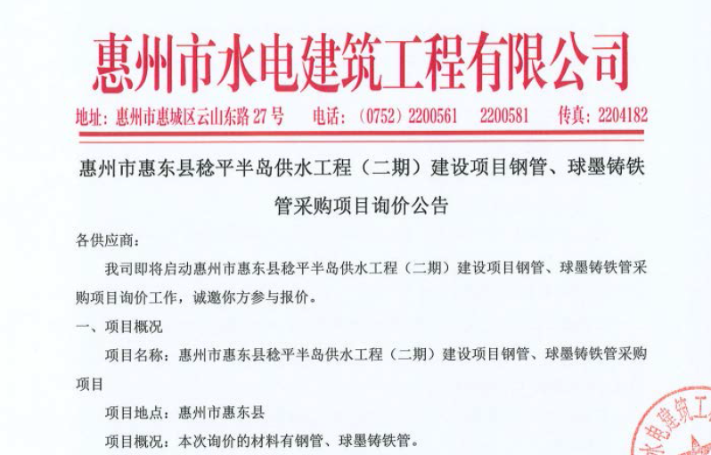 惠州市水電建筑工程有限公司成立于一九六四年四月,隸屬惠州市水務集團有限公司,是一家國有綜合性施工企業,主營水利水電工程、房屋建筑、市政工程等施工業務。公司擁有水利水電工程施工總承包一級、建筑工程施工總承包一級、市政公用工程施工總承包一級、公路工程施工總承包三級,公路路基、路面及建筑裝修裝飾專業承包二級,環保工程、機電安裝、河湖整治、輸變電工程專業承包三級等經營資質……